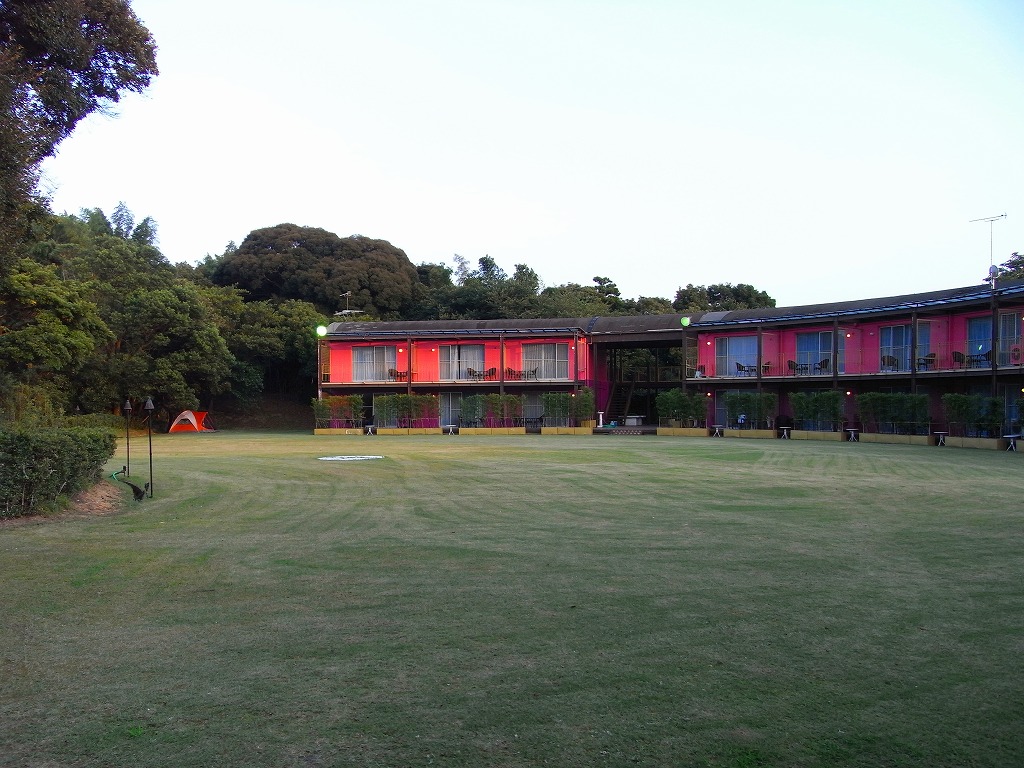 こちらは宿泊施設、丁寧な芝生の広場。誰もいなくて贅沢な感じ。